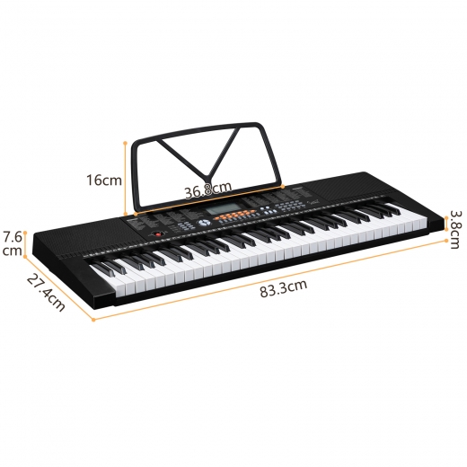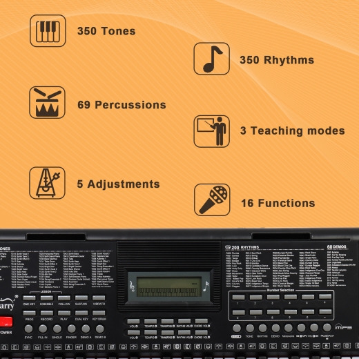 2. Functions: 61 keys, 200 timbres, 200 rhythms, 60 demo songs, 61 types of keyboard percussion, and features like sound volume adjustment, multi-tone selection, metronome function, teaching function, sound recording, playback function, split/touch control function, and more.