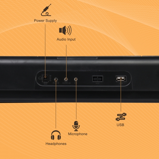The keyboard has a multifunctional panel with ports for headphones, audio, phone, iPad, and microphone. It allows for flexible usage and helps enhance the music-playing experience by enabling connection to a variety of devices.