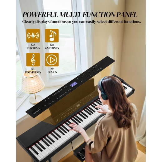 【ONE-TOUCH MULTI-FUNCTIONAL PANEL】This 88 key keyboard boasts a robust multi-functional panel that clearly displays 15 different functions, including volume adjustment, multi-tone selection, recording control, playback features, and dual keyboard split buttons, among others. Capable of delivering up to 64-note polyphony, it also is enriched with 128 rhythms and 128 GM tones, making it the perfect choice for musicians of all levels